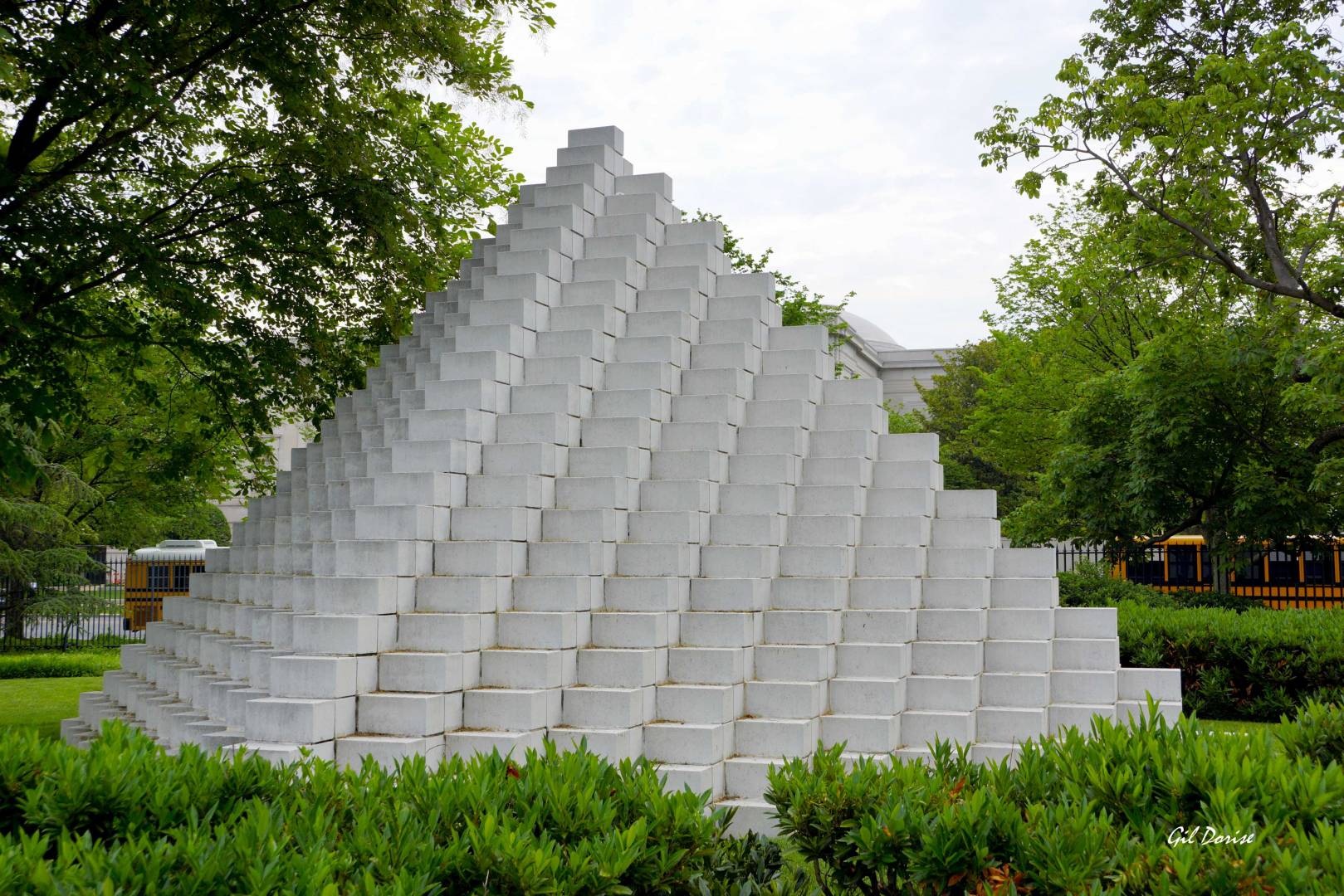 Oui,le sujet répond bien aux exigences du thème. Personnellement j'aurais cadré encore plus serré .Un recadrage est possible . en outre,la trop grande visibilité des éléments orange à l'arrière-plan attirent trop l'oeil car avec la verdure présente nous avons une confrontation visuelle de deux couleurs complémentaires ! On ne voit plus qu'elles et c'est physiologiquement parlant normal .C'est bien sûr au détriment de l'oeuvre qui ,de fait,paraît bien pâlichotte . Avec un logiciel de retouche ,j'éliminerais l'orange. Pour moi,la meilleure solution consisterait en une prise de vue sous un éclairage plus contrasté afin de mettre en valeur les éléments géométrique de l'oeuvre.