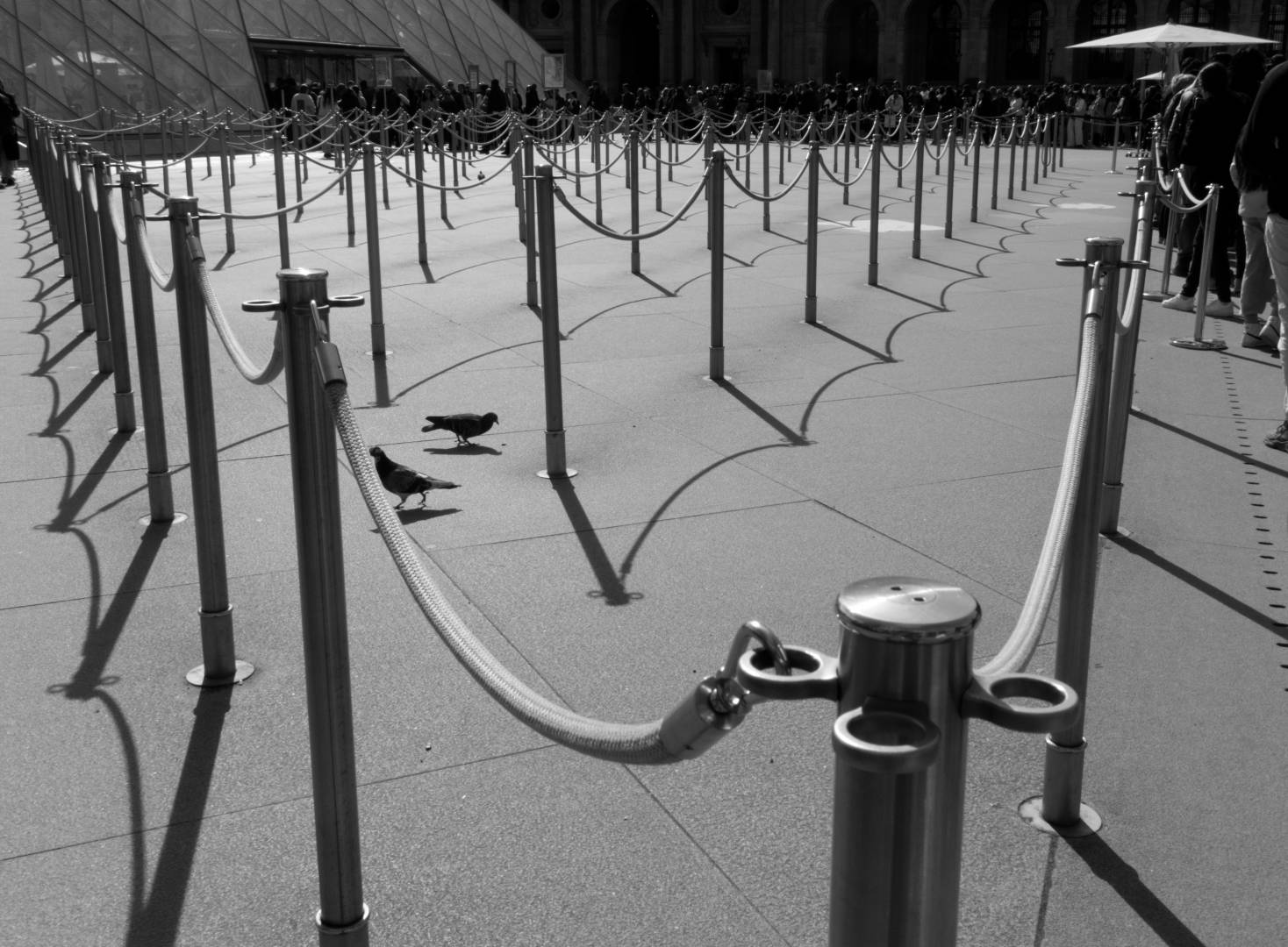 Je pense également qu'il y avait mieux à faire au niveau cadrage. Toute la partie haute ne donne pas de valeur graphique à la photo, de même que la file de spectateur. en revoyant le cadrage, il y a sans doute mieux à obtenir. En gardant simplement les pigeons et quelques poteaux...