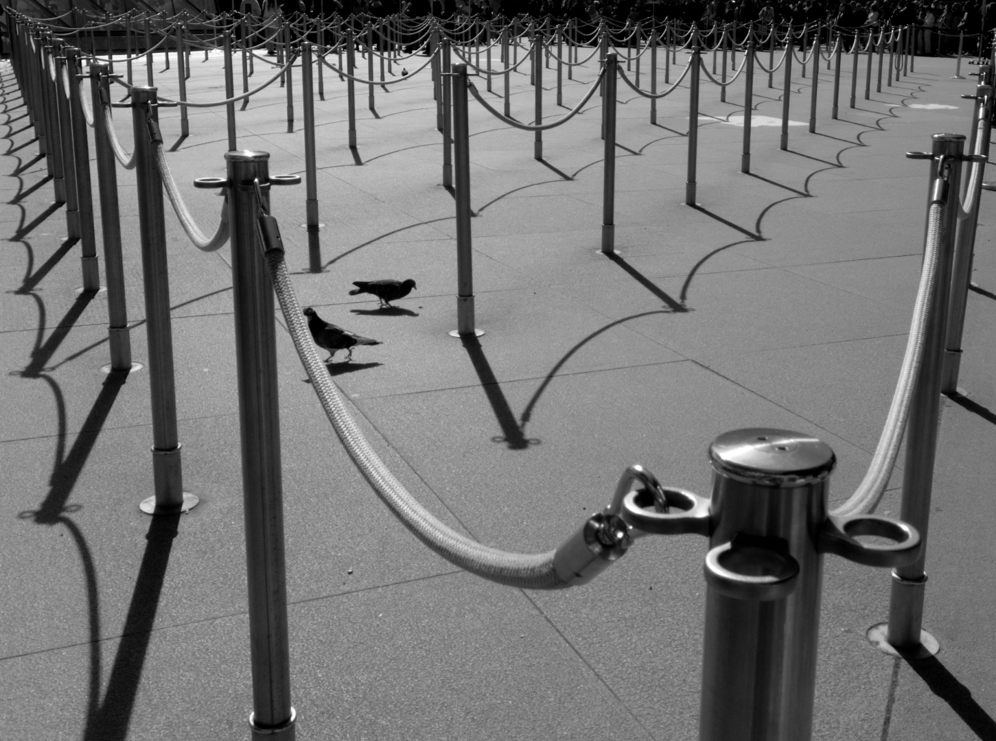 Bonjour Claire, pour moi, elle l'est sur un point mais pas dans la globalité. Les poteaux du premier plan, ceux près des pigeons et les ombres, le reste est "noyé" dans une masse, où les lignes et formes ont du mal à se détacher. C'est quasi du ton sur ton, poteaux, cordes, file d'attente (sur fond sombre). Selon moi, le point de vue ne permet pas d'exploiter le graphisme de la scène dans son ensemble. Il y a matière pourtant, pyramide, cordes et poteaux, ombres, file d'attente, une plongée avec "beaucoup" de hauteur serait intéressante. Tout n'est pas faisable dans certaines conditions. Vu la situation il y avait un choix à faire avec peu de temps et d'espace disponible, sur les pigeons et leur environnement très proche il y avait peut être qqchose de faisable, c'est ce que je remarque du point de vue que tu as choisi. Qques pas de plus et regard vers la gauche sur les oiseaux, une idée en regardant la scène que tu nous montres.
