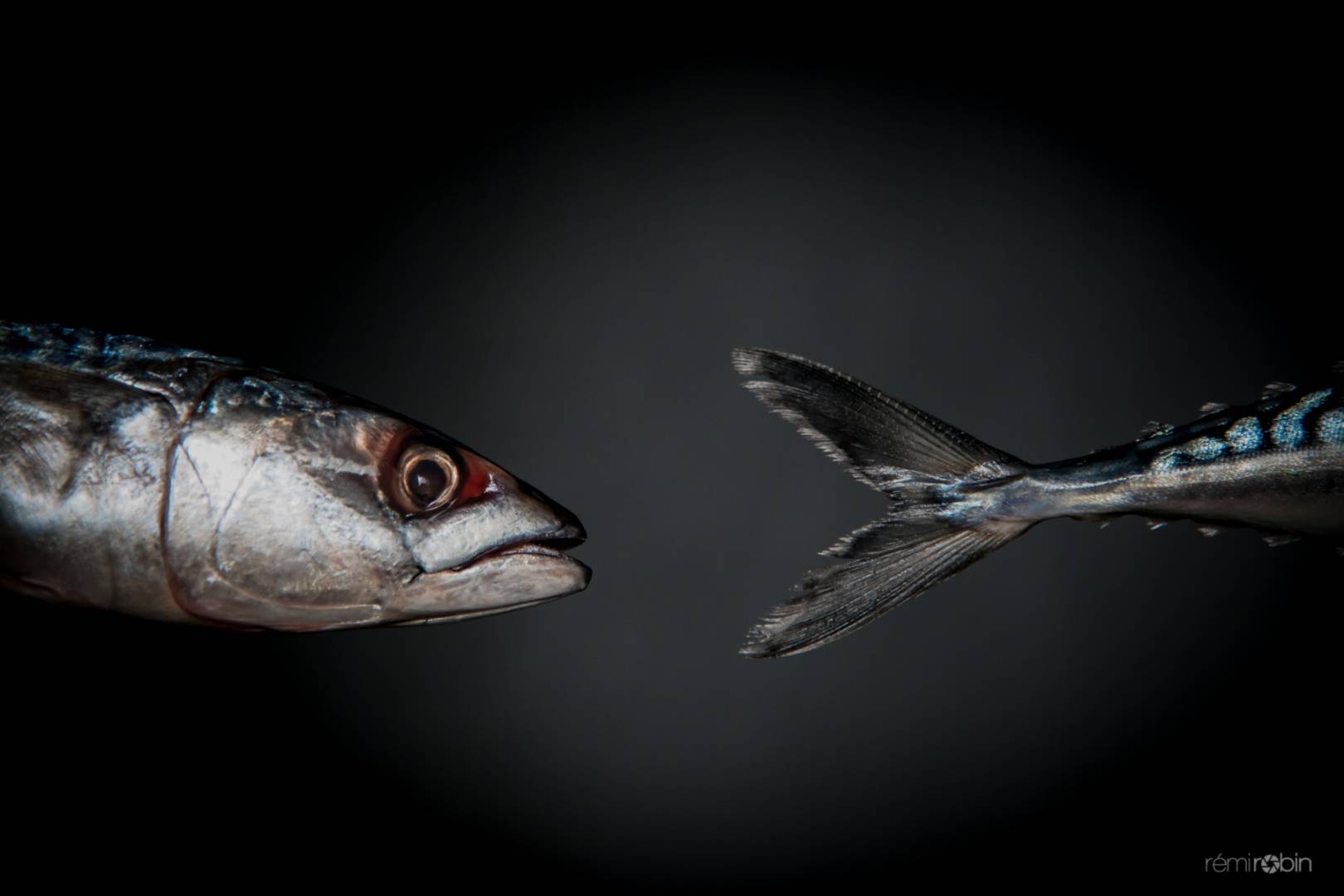 La 1 pour une belle nature morte, ou le poisson est reconnaissable par sa "robe". Il est passé dans beaucoup d'assiettes, donc bien connu. Et les codes de l'emballage d'une certaine époque. Une petite préférence pour la 2, la mise en scène nous laisse penser qu'ils ne font que passer. Elle me rappelle certaines photos sous-marine où l'ambiance est sombre et la lumière du projecteur sur un endroit. Moins la 3, je ne suis pas certains qu'on le reconnaisse facilement seulement avec la tête, contrairement aux rayures "tigre" et ce bleu. Mise en scène moins originale selon moi.