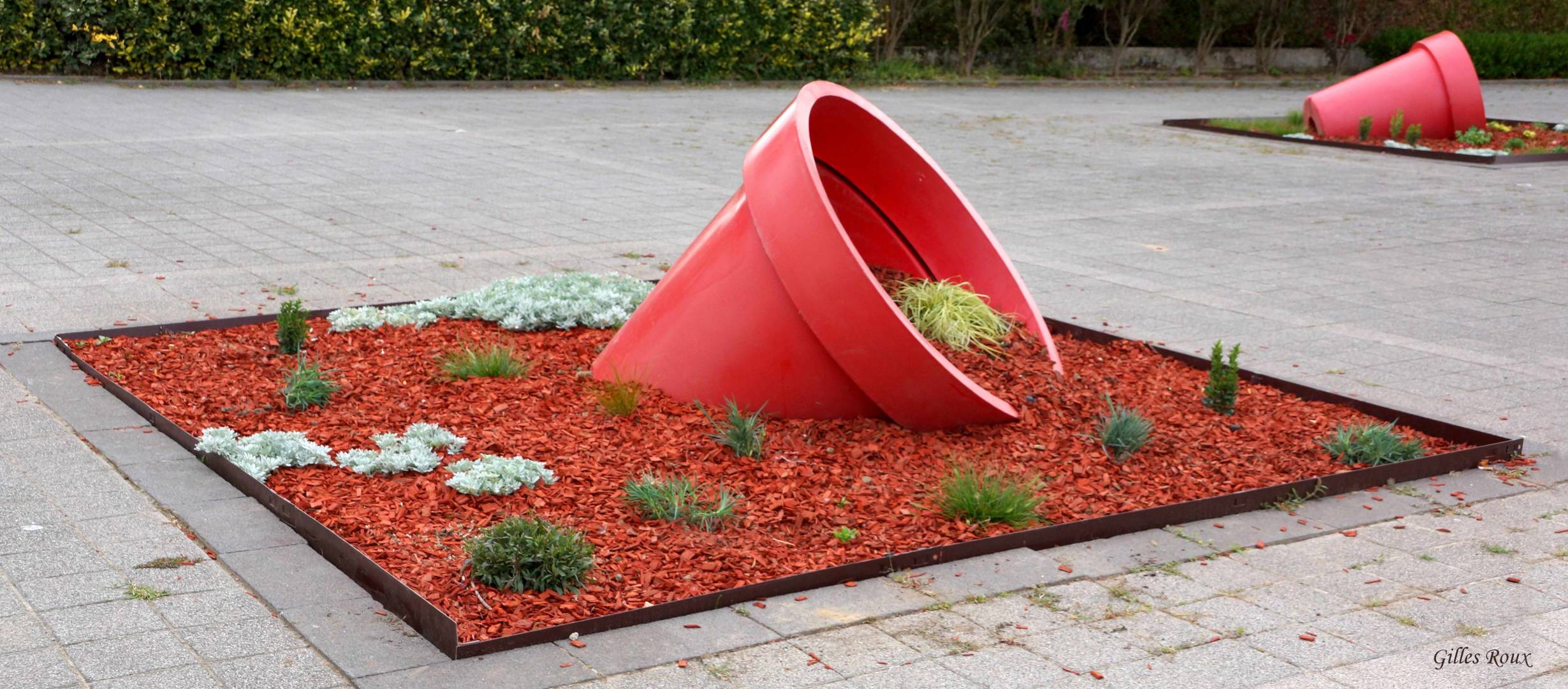 Oui je vois un contraste vert et rouge mais celui qui m'apparait le plus important c'est un contraste de forme entre la surface carré et le pot rond. Pour faire l'horizontalité de la 2 j'ai choisi la plaque avant du carré. Voici ce que j'ai fait mais j'accepte toutes les remarques.