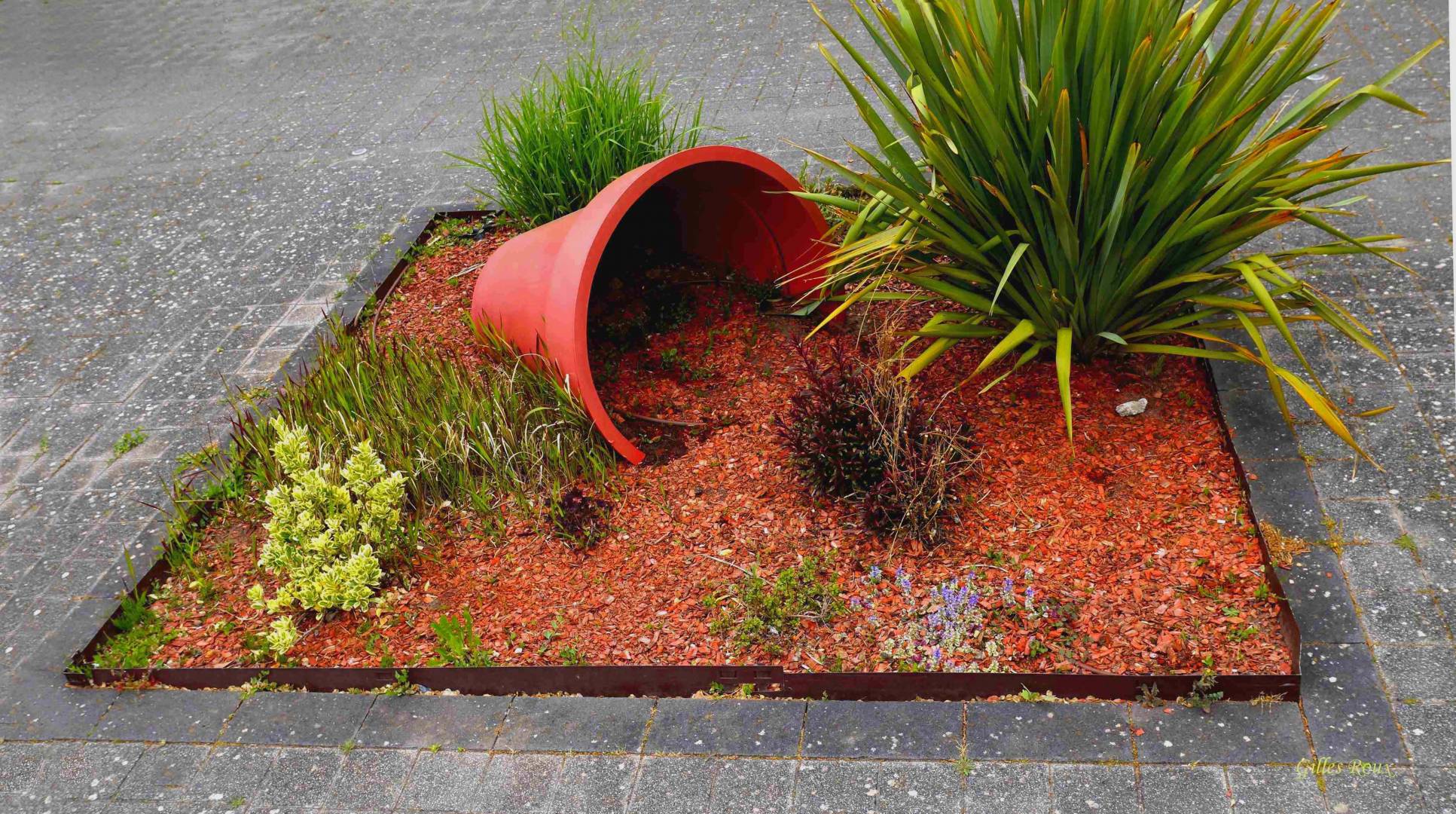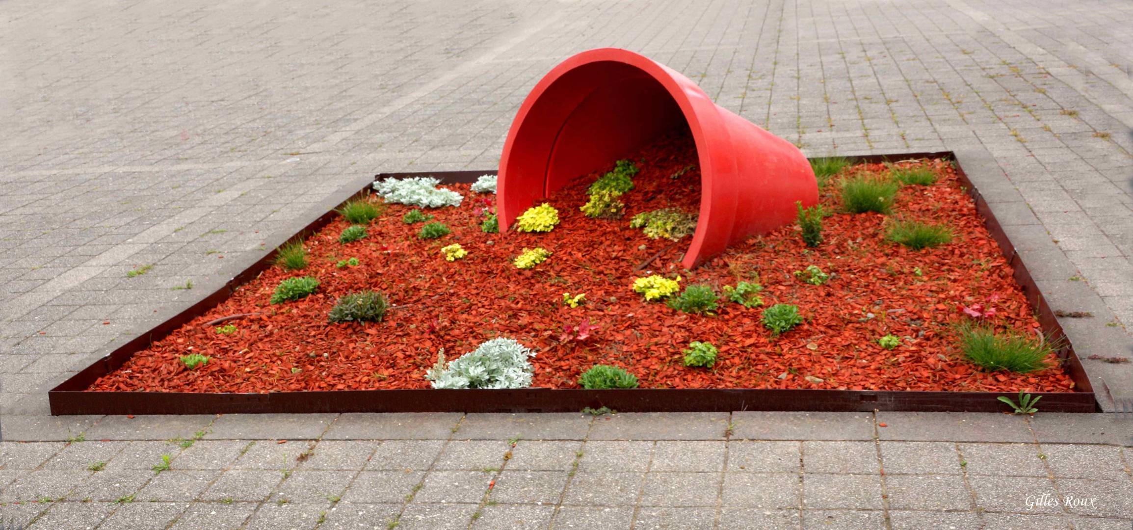 Pour accentuer et ne voir que ça, contraste de formes et de couleurs. Y a t-il possibilité de faire une photo avec un point de vue plus haut, pour ne cadrer que sur le carré avec l'ouverture du pot. Ou avec un strict minimum de gris. Plutôt la 2 pour moi, sur la 1 ce qu'il y a autour est de trop à mon avis.