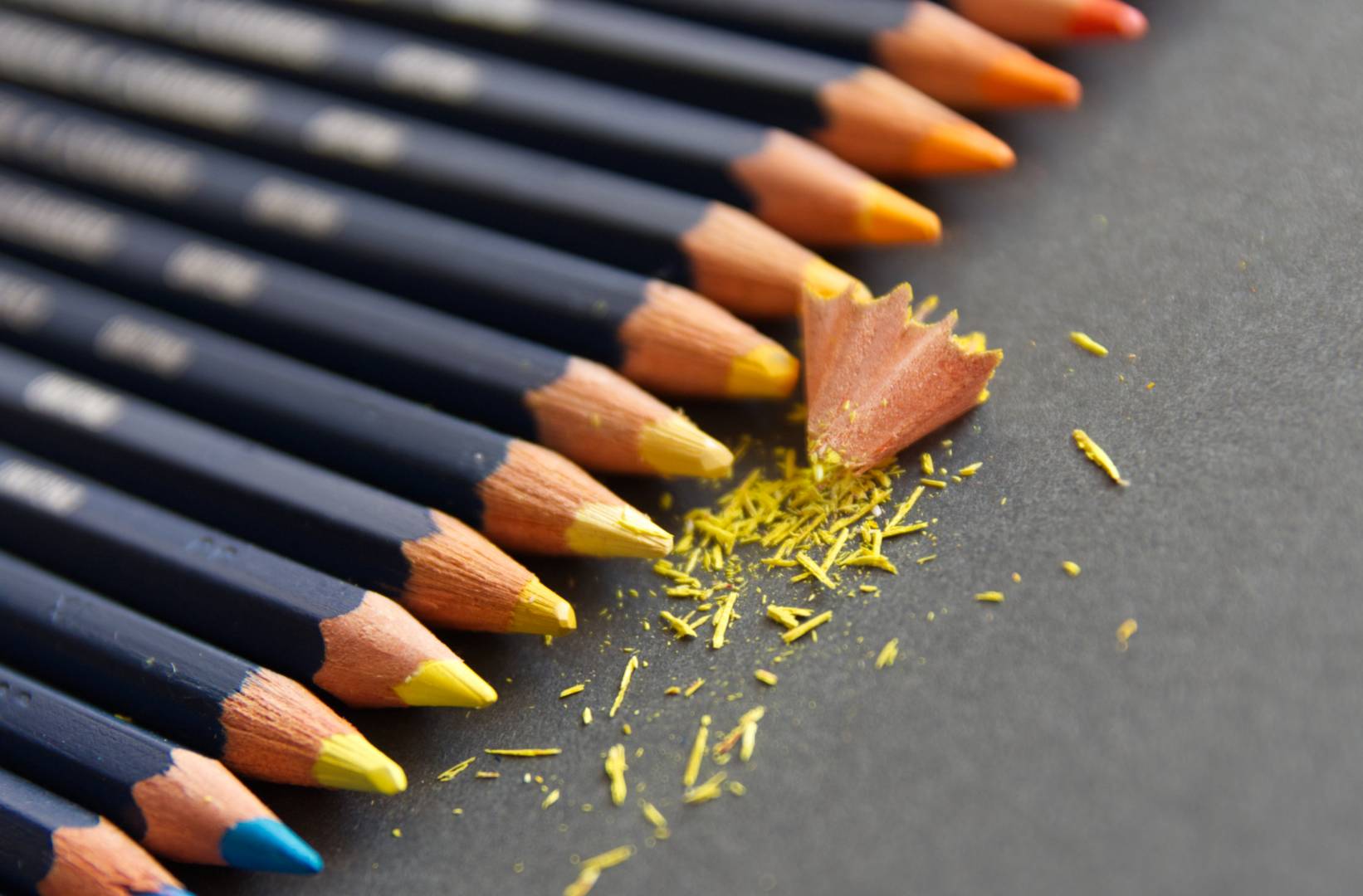 Dans l'idée la 3 est celle où je pense le plus à jaune, pour moi le copeau ne sert à rien contrairement aux restes de mines. Peux tu attendre ou les déplacer (un peu) pour que la lumière ne fasse pas de reflet sur les mines. C'est dommage de perdre de la couleur sur ces petites surfaces. En dosant le nombre de crayons qui encadrent les jaunes, l'idée du contraste des complémentaires est jouable.