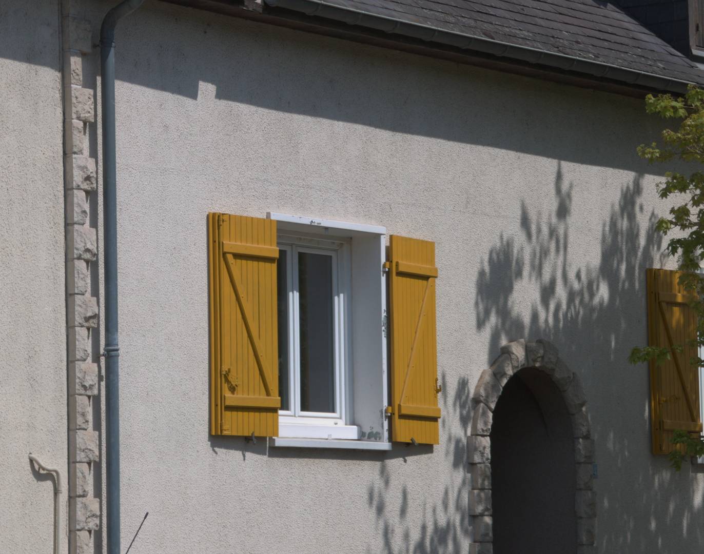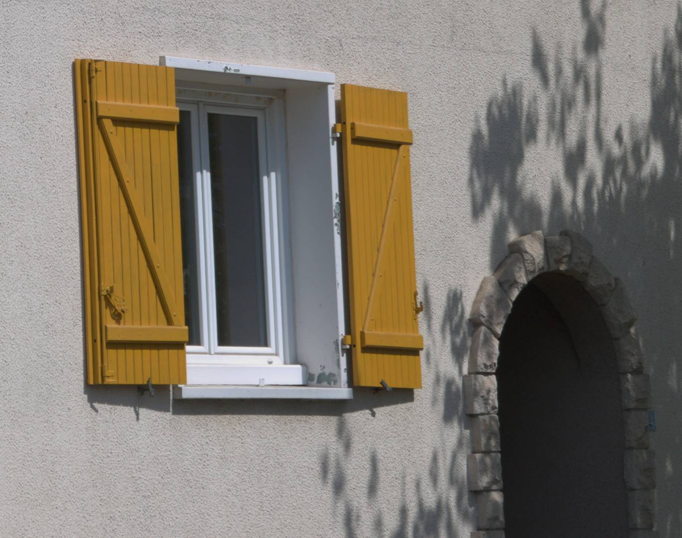 1- Personnellement je ferai une coupe franche pour ne garder que volet/fenêtre, porte et ombre de l'arbre. Le jaune devient plus présent. On a ainsi "un point" (le jaune), un contraste tonale et un contraste de formes.
