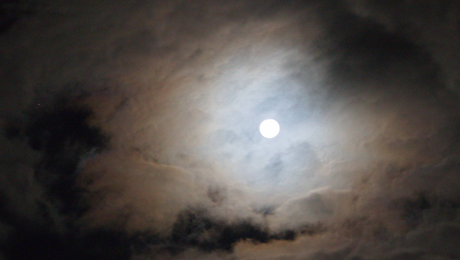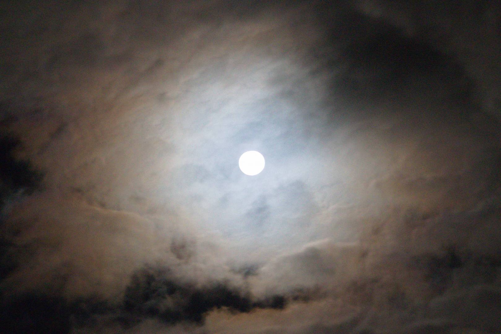 Je n'ai pas centré la lune pour bien voir les différentes tâches noires dans les nuages. je ne trouve pas gênant qu'elle ne soit pas cadrée.