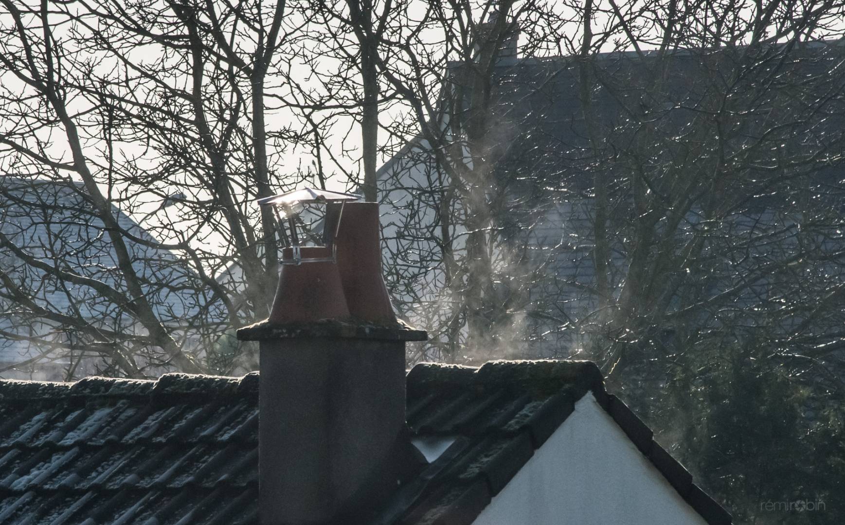Proposition : pour mettre plus en valeur la "fumée" au dessus du toit et pour éviter que le regard ne soit attiré par la bande blanche en haut à droite, je recadrerais ce coin haut/droit de manière à supprimer le ciel de cette zone.