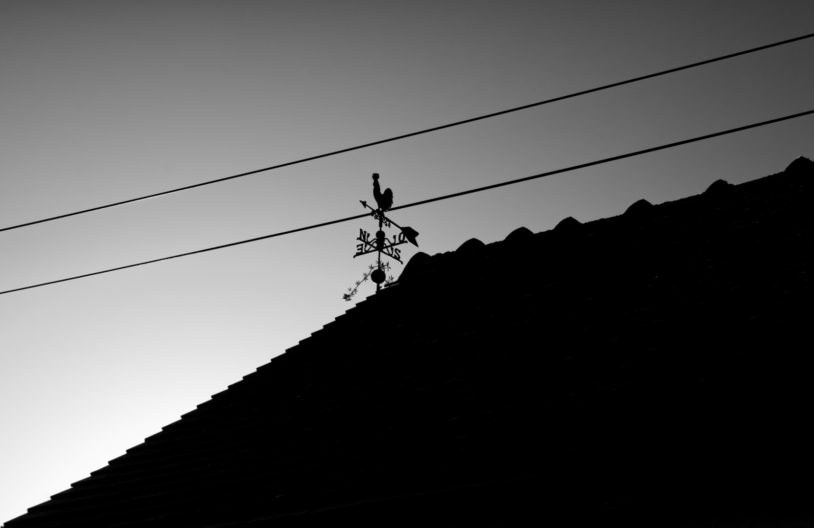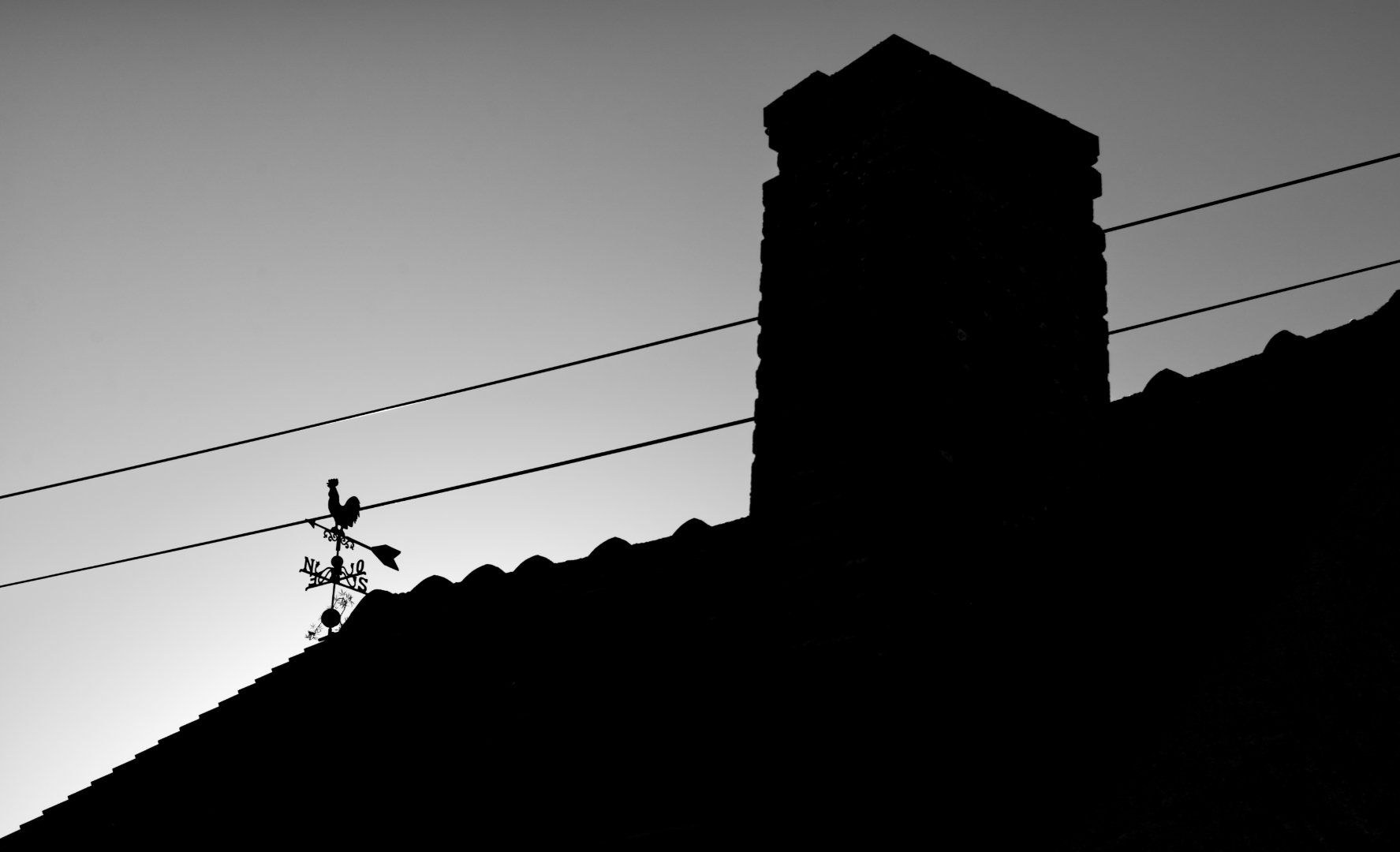 Le coq de la 1, un peu plus haut pour être entre les fils, sur la 2 c'est faisable. Les lignes continues contrastent avec les lignes de contours, cheminée comprise. Le truc qui m'interpelle, un peu, c'est que les fils se trouvent brisés. C'est pas grand chose mais bon, c'est l'explication que je peux donner à ce ressenti.