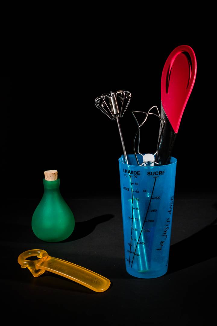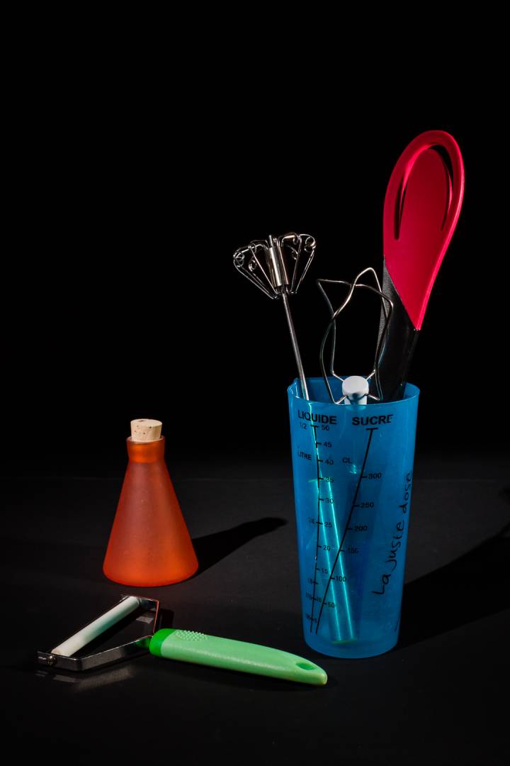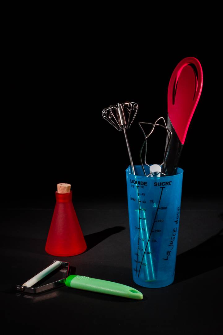 Le regroupement des couleurs. Partie basse trois couleurs proches bleu jaune et vert, et le rouge qui contrebalance en haut à droite. Sur la 102, le récipient orange me gêne par sa couleur.