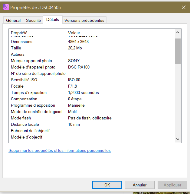 Je ne comprend pas trop alors les renseignements obtenus en faisant un clic droit sur l'image, propriétés/détails et ce que je vois affiché à la prise de vue. A l'occasion j'amènerai mon appareil.