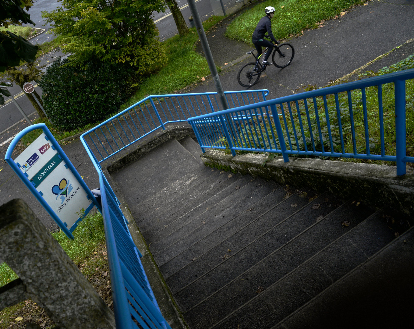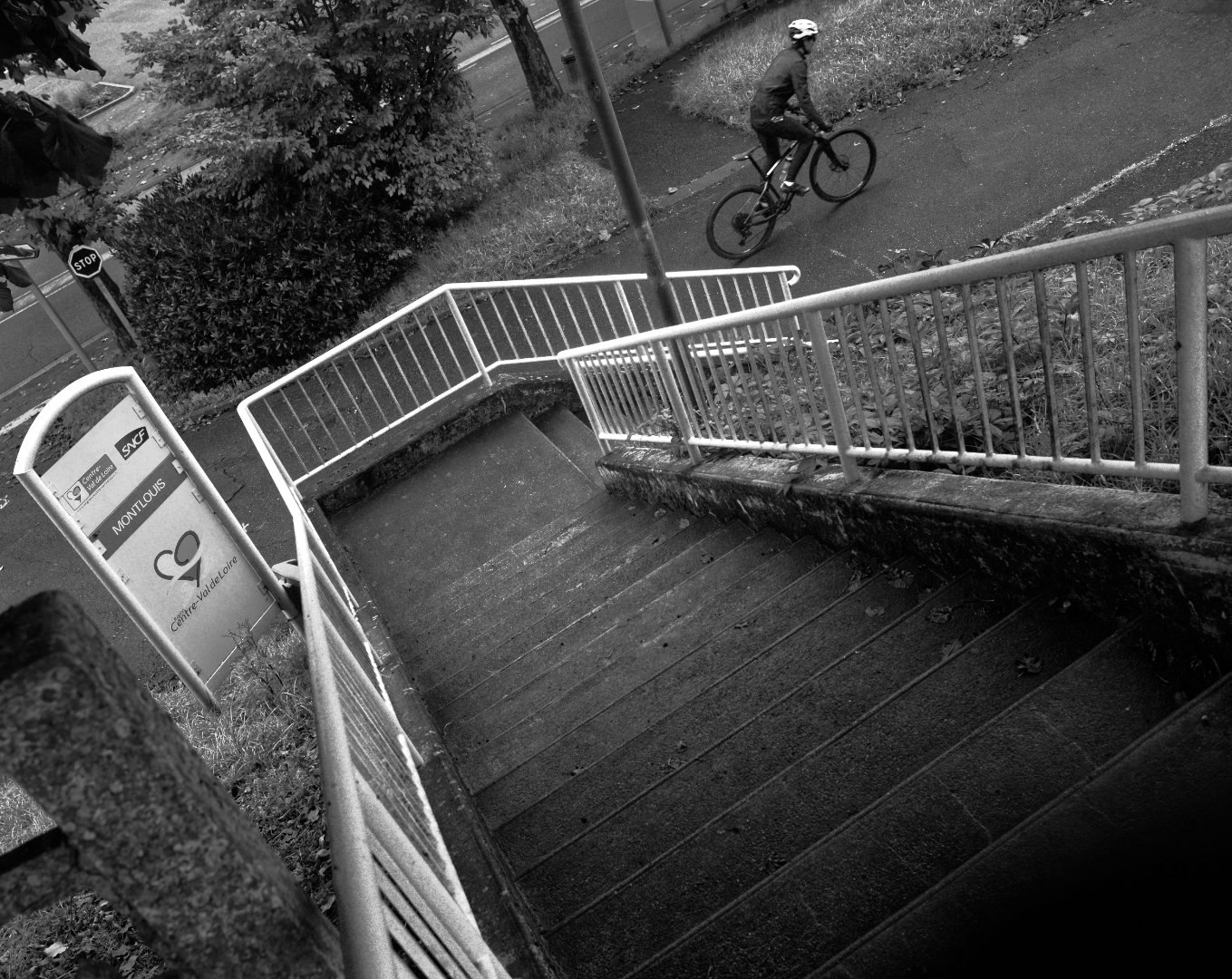 D'un point de vue photographique pur, je préfère la N&B. D'ailleurs, elle me fait penser à une photo d'un grand photographe, (je n'arrive pas à la retrouver ) ou l'on voit également en contre plongée un personnage qui passe au bas d'un escalier. Moussa si tu peux rafraichir ma mémoire ?