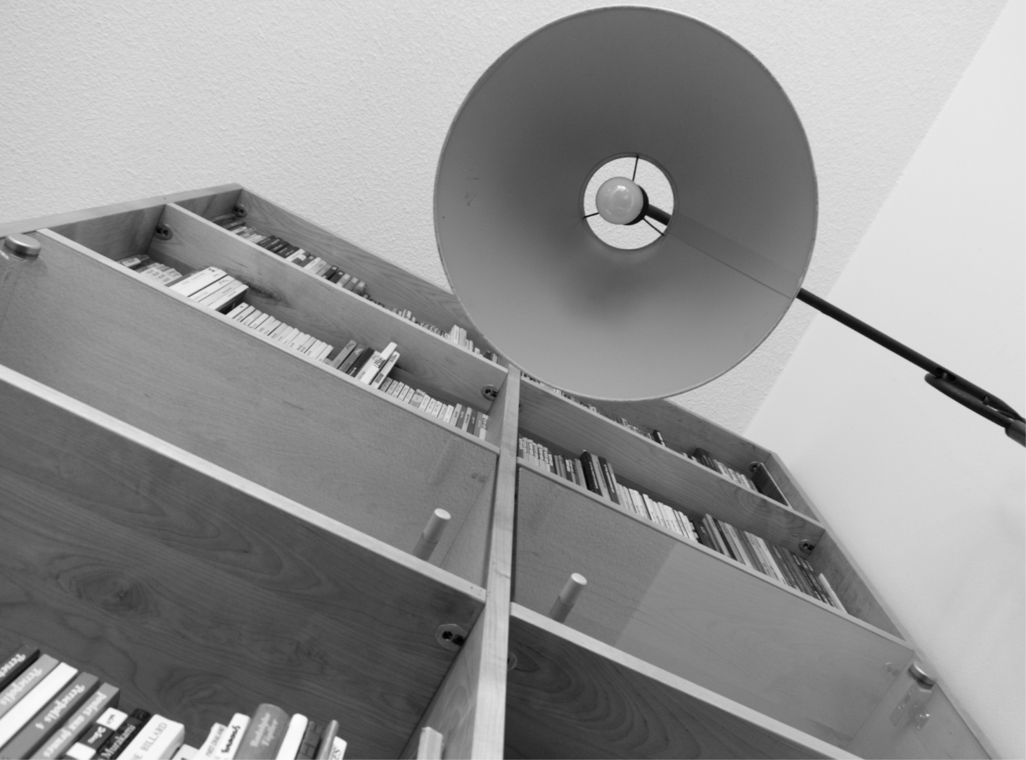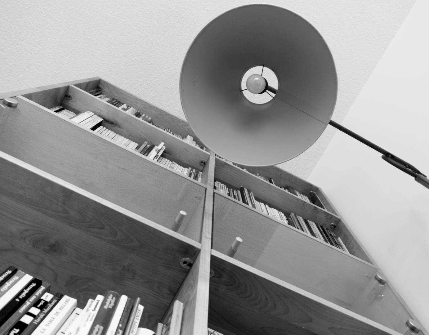 Un point de vue bien inhabituel, oui, d'un coin lecture. Pour le cadrage, un format portrait au grand angle, accentuerai cet effet de grandeur. Quitte à avoir de petites déformations. Pour le côté graphique, je trouve aussi qu'il manque du contraste pour mettre en avant les formes et les lignes (voir la texture du bois). La densité des couleurs d'origines doivent être trop proche pour un passage en NB simple, peut être que le mélangeur de couches en posttraitement peut apporter une amélioration. Pour "graphisme" as tu essayé avec la lampe allumée (la monter un peu ??) et un peu de pénombre (marquer les lignes, jouer sur les ombres, etc), et en tentant des angles qui évitent le contre jour. Jouer, tenter, observer....