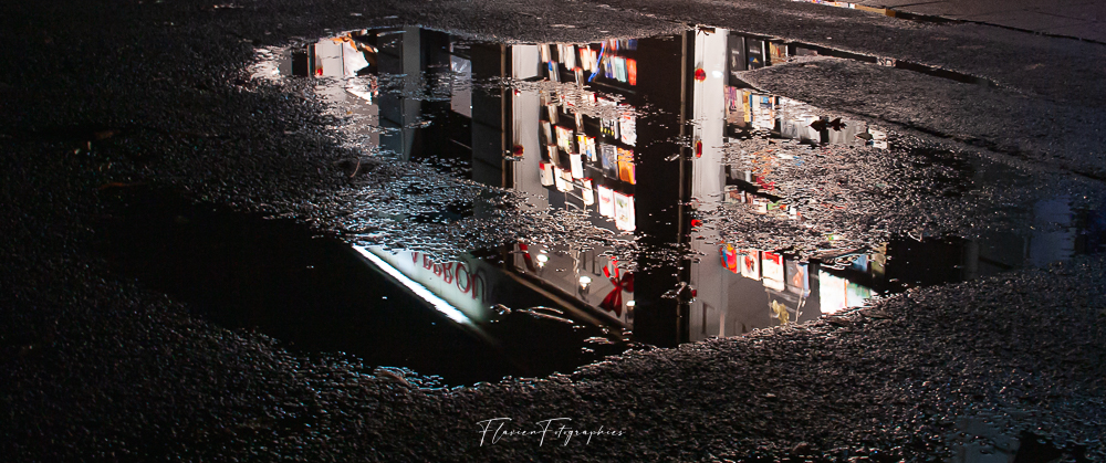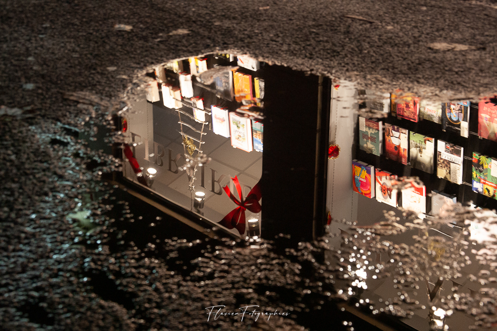 La première, le cadrage situe le lieux, l'exposition l'heure. Même si la mise au point n'a pas l'air d'être faite sur la devanture, le sujet est lisible. C'est un reflet dans une flaque d'eau c'est clair. Personnellement je l'aime bien, mais retourner sur l'axe horizontale comme on peut le faire avec des ombres. cela lui donne, c'est mon ressenti, autre chose que l'effet d'un reflet. Dans ce sens, elle résonne plutôt bien avec l'actualité du livre et des librairies.