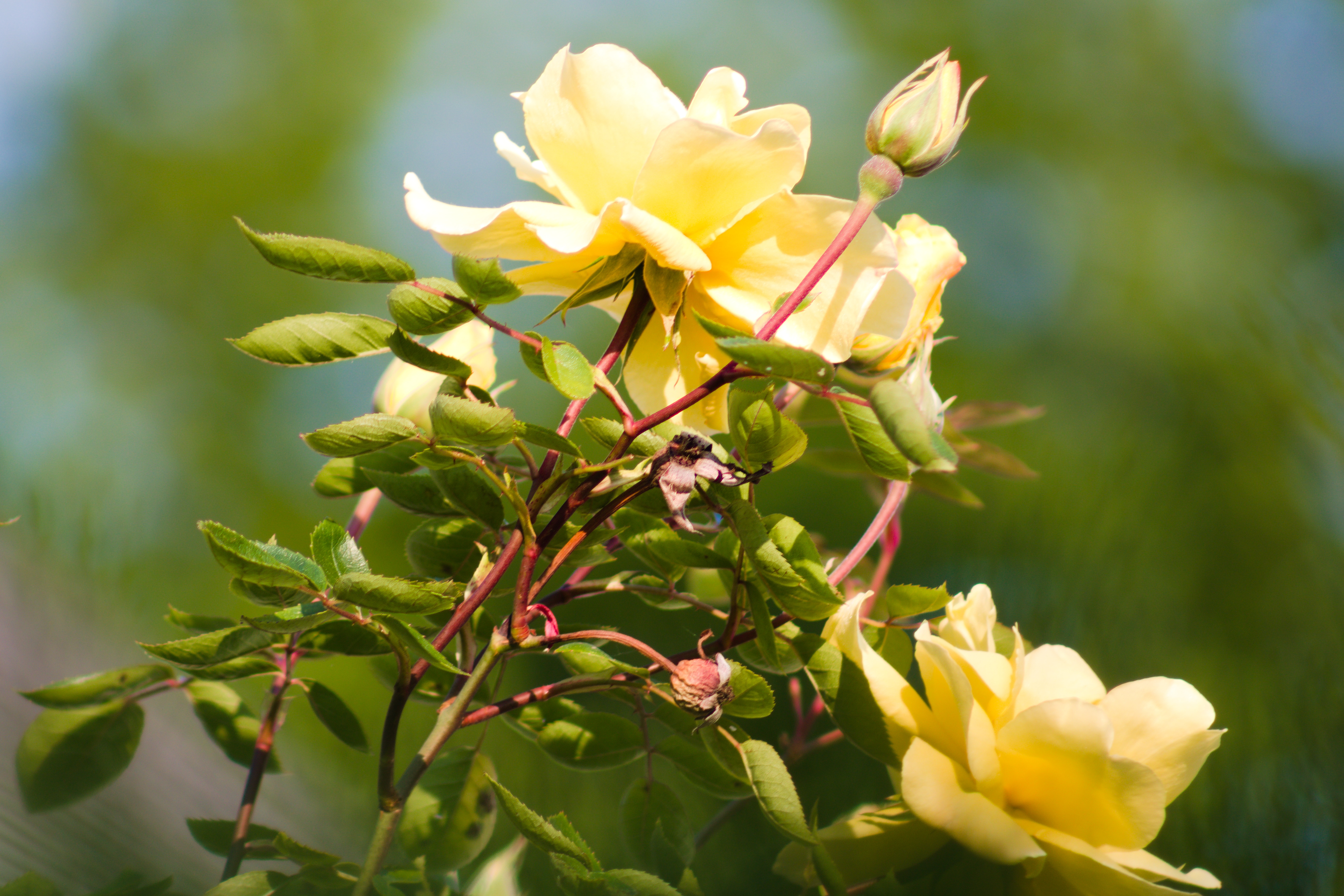 Le flou de l'arrière plan est effectivement agréable mais pour que l'ensemble soit bien réussi, il faudrait que le sujet soit parfaitement net. Ici la difficulté est due à ce rosier un peu trop "fouillis" et qui se réparti sur plusieurs plans, ce qui complique le choix de mise au point et de profondeur de champ : trouver le bon compromis entre une grande ouverture pour assurer le flou de l'arrière plan, mais aussi une ouverture pas trop grande pour que toutes les roses soient parfaitement nettes.