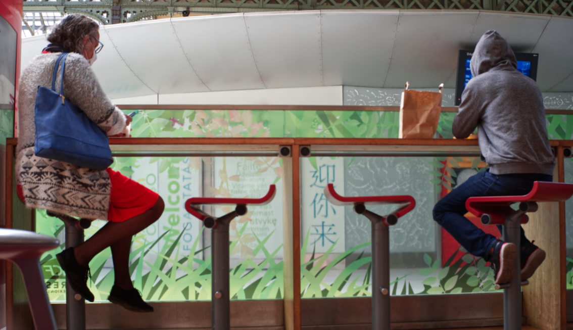 Pour la deuxième, bien sûr, ne laisser qu'un personnage dans le cadre rend peut-être sa solitude plus évidente, mais pourtant ces deux personnes isolées chacune dans leur bulle, l'une avec son smartphone, l'autre sous sa capuche illustrent bien leurs solitudes dans un lieu normalement convivial.