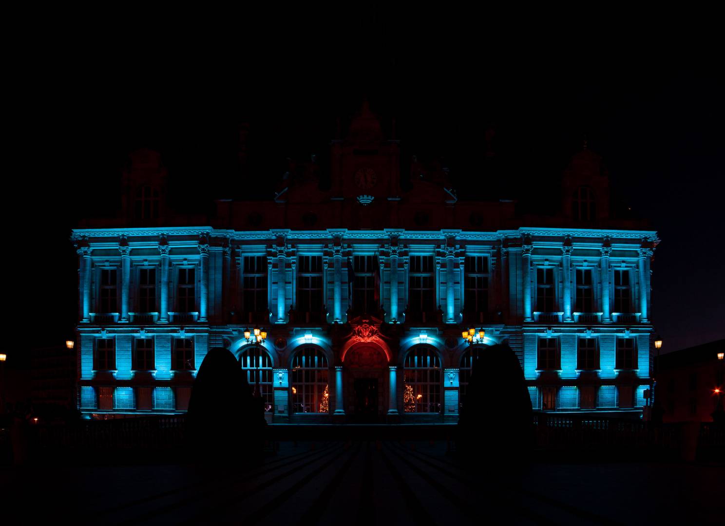 Les couleurs mettent bien en évidence la façade, la touche rouge sur la porte centrale rompt la monotonie de l'ensemble. Il fallait prendre le cliché au bon moment car les couleurs étaient changeantes je suppose.