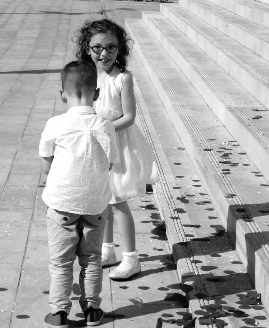 Bravo Odile, pour avoir déclenchée au bon moment (à un poil près quand même). Regard et sourire, puis le passage de ces personnes. Sur la 2, les plots sont là, on fait avec. Eh oui le petit regret, que celui de gauche enlève un pied. Le noir et blanc leur va bien, mais la 1 pourrait être en couleur. La place est blanche, je suppose que les enfants étaient en blanc et les pétales rouges, si c'est le cas alors "l'ambiance" serait tout autre. A voir